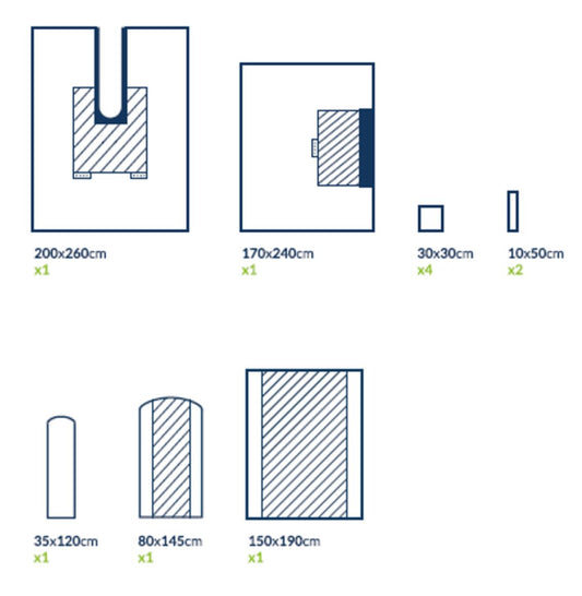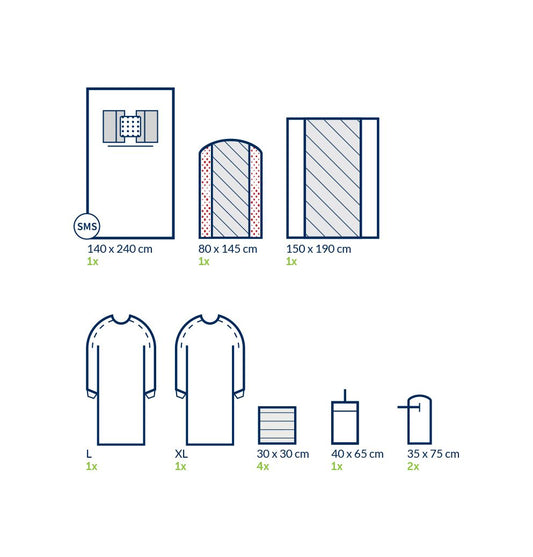 Kit de gynécologie avec champs adhésifs renforcés, champs sans adhésif, serviettes absorbantes, ruban OP, couvre membres, housse mayo renforcée et housse de table renforcée - 1 kit